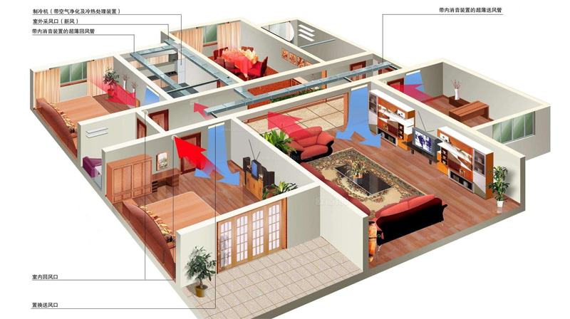 新風系統(tǒng)能24小時源源不斷向室內(nèi)提供新鮮空氣,將室外新鮮空氣經(jīng)過處理后送入室內(nèi),通過風口、排風管道和風機將室內(nèi)污濁空氣排出室內(nèi)。