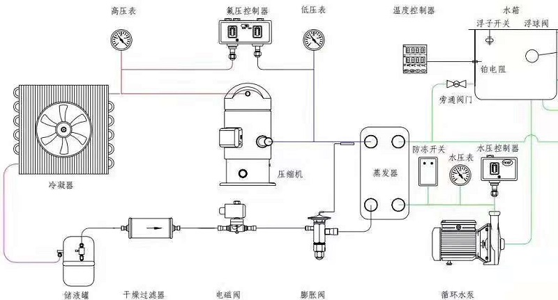 根據(jù)制冷系統(tǒng)原理,低溫低壓的液態(tài)冷媒在蒸發(fā)器里面與周圍水進(jìn)行熱交換蒸發(fā)器吸收水的熱量,蒸發(fā)成低溫低壓的氣態(tài),蒸發(fā)過程中冷媒溫度不變,低溫低壓氣態(tài)的冷媒進(jìn)入到壓縮機(jī),經(jīng)壓縮機(jī)壓縮,被壓縮成高溫高壓的氣態(tài),然后進(jìn)入冷凝器,在冷凝器里與室內(nèi)的介質(zhì)進(jìn)行熱交換,高溫高壓的氣態(tài)的部份熱量被介質(zhì)吸收,介質(zhì)溫度升高,冷媒放熱冷凝器變成高溫高壓液態(tài),冷凝器過程溫度不變,然后進(jìn)入膨脹閥進(jìn)行節(jié)流,節(jié)流是迅速降溫的過程,冷媒變成低溫低壓的液態(tài),此過程后的冷媒再進(jìn)入到蒸發(fā)器進(jìn)行換熱蒸發(fā),從而實(shí)現(xiàn)制冷系統(tǒng)的整個過程,這種循環(huán)是連續(xù)進(jìn)行的,水才得以連續(xù)不斷的制冷。