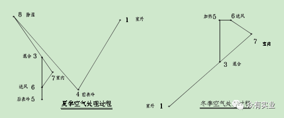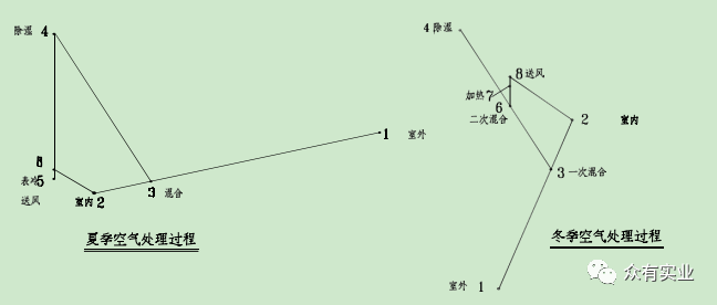 此系統中,夏季:溫度為 Tw 濕度為 RHw 的室外風經與室內風經一次回風混合后,達到某一狀態點3,進入轉輪除濕機,其出風狀態點為 4Rho 小于 4%T 達到 43℃左右),然后再經過表冷器干冷處理后達到狀態點 5,經風機溫升達到狀態點 6 后送入室內,以保證室內狀態參數 TnRHn。冬季:溫度為 Tw, 濕度為 RHw 的室外風經與室內風經一次回風混合后,達到某一狀態點 3,取一部分回風進入轉輪除濕機,其出風狀態點為 4Rho 小于 4%T 達到 43℃左右),再與未經過除濕機的回風經二次回風混合后達到混合點 6,然后經蒸汽加熱器處理后達到狀態點 7,經風機溫升達到狀態點 8 后送入室內,以保證室內狀態參數 TnRHn。此類系統可以提供 RHn=2%~30%的環境參數,常用于濕度要求較高的系統。
