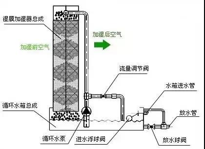 潔凈的自來水通過進水管路進入循環水箱中,通過進水開關控制其高水位;當加濕器工作時,循環水泵將水箱中的水輸送到加濕器頂部的淋水器,淋水器確保水均勻分配到濕膜材料上,水從濕膜材料頂部向下滲透,同時被濕膜材料吸收,形成均勻循環水的水膜;當干燥的空氣通過加濕器時,一部分水與空氣接觸,汽化、蒸發,使空氣濕潤(即濕度增加);另一部分沒有蒸發的水從加濕器低部流回循環水箱;循環水箱中的水通過循環水泵反復循環使用,從而使通過濕膜的空氣得到加濕。當循環水箱中的水位有所下降時,進水開關開啟,給水箱補水,確保水箱的水位維持在設定的高度范圍;當循環水箱中的水位下降到一定高度時,水箱內的低水位開關工作,確保循環水泵在缺水的情況下停止運轉。循環水濕膜加濕器結構圖當循環水箱內的水循環一定時期后,通過水箱的排水口將水排出,清洗水箱,置換干凈的水,保證了循環水和被加濕的空氣不被二次污染。